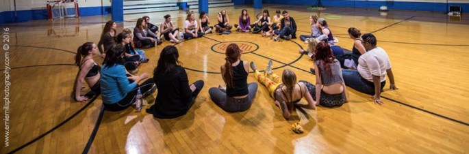The set up of class as a dojo, borrows its physical layout from martial arts instruction. Practiced students are asked to place themselves on the front line of class, beginners form toward the back and lines develop in between them. As the front line drives the components we explore, we start by seeing the the end goal first. Establishing an expansive direction gives the front line a place to begin practice while the basic forms are taught. The front line explores and pushes the end goal as coaching continues throughout each component.